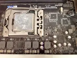 Откройте защёлку в креплении процессора, чтобы очистить вокруг процессорного чипа. Не снимайте процессорный чип: это неоправданный риск. Под чипом нет ничего, что требовало бы очистки, а есть много вещей, которые легко повредить.