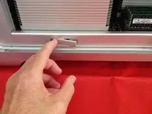 Нажмите на два фиксатора (один виден здесь), чтобы отсоединить лоток с процессорами от корпуса. Потяните лоток на себя, чтобы извлечь его из шасси.