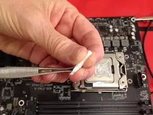 Вырежьте маленькие кусочки безворсовой ткани и обмотайте ими наконечник пинцета. Смочите ткань в изопропаноле и очистите узкие промежутки между компонентами.