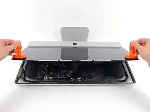 При сборке iMac приклейте двустороннюю ленту на экран и корпус