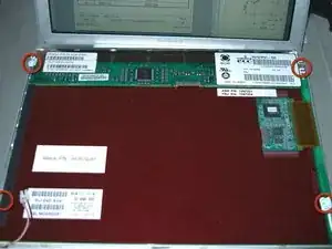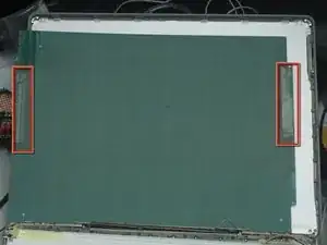 Поднимите концы ленты с обеих сторон на стороне CCFL и удалите 2 чёрных винта Phillips, отмеченные красными кругами.