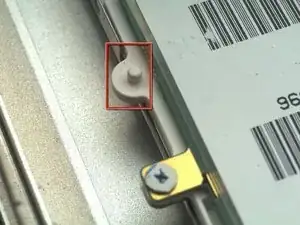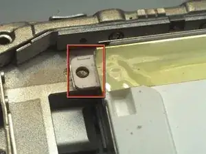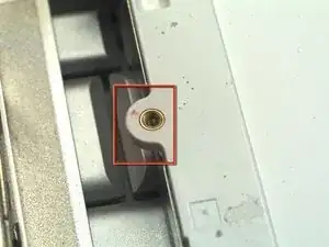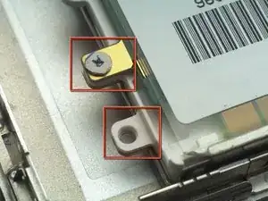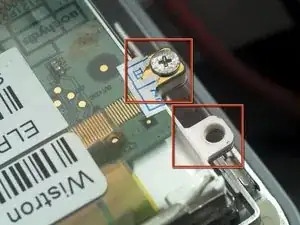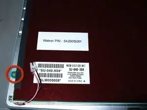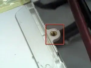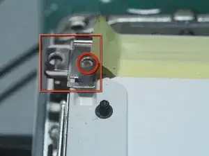Удалите винт Torx T6 из нижнего левого угла узла дисплея. Корпус компьютера не позволит вставить отвертку прямо в винт, поэтому будьте осторожны, чтобы не сорвать шлиц.