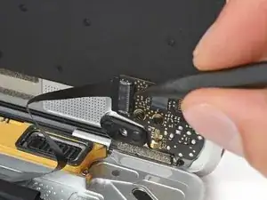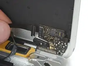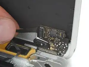 Используйте пинцет, чтобы отогнуть ленту, закрывающую ZIF-разъём кабеля трекпада.