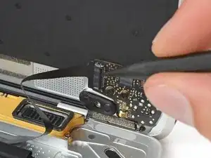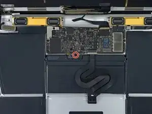 Снимите единственный винт T5 Torx 2,9 мм, фиксирующий разъём питания батареи на плате логики.