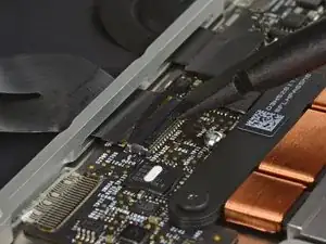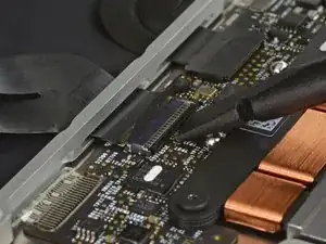 Используйте плоский конец лопатки, чтобы отсоединить кронштейн кабеля порта USB-C, поддев его вертикально вверх от платы логики.