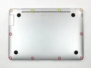Снимите десять винтов с крестовой шлицем, крепящих нижнюю крышку к MacBook Air: