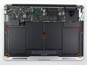 Удалите следующие пять винтов, крепящих аккумулятор к верхнему корпусу: