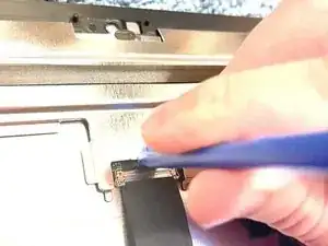 Используйте монтажную лопатку, чтобы приподнять маленькую планку, фиксирующую гибкий кабель в верхней части дисплея.