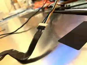 Если кабель приклеен к шасси, используйте нагретый iOpener или фен, чтобы размягчить клей. Затем можно поддеть кабель монтажной лопаткой, чтобы ослабить его. Никогда не тяните прямо за деликатные разъёмы.