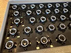 Чтобы правильно установить клавиши, обратите внимание, что буквы находятся в левом нижнем углу клавиш. Также клавиши более округлые внизу. Вы можете найти место для рычагов белой пружины на обратной стороне клавиш.