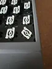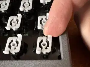 Клавиши соединены двумя зажимами с левой и правой стороны. Большие клавиши соединены со стабилизаторами, будьте осторожны при снятии этих клавиш, так как подлежащий пластик имеет выступы, которые могут сломаться.