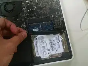 Снятие оптического привода и модулей оперативной памяти в белом MacBook Unibody.