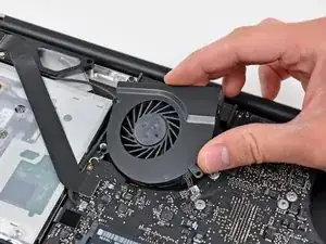 Снимите три винта Torx T6, крепящие правый вентилятор к верхней части корпуса.