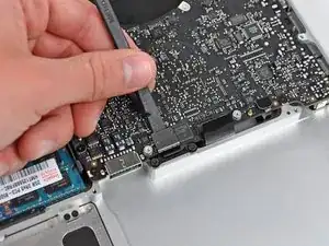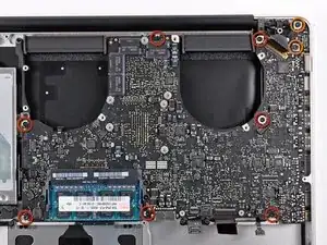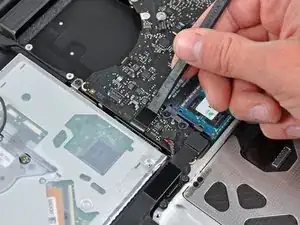 Шаги по разборке соответствуют Замене логической платы MacBook Pro 15" Unibody Mid 2010. Для данного руководства не требуется снимать вентиляторы, тепловые трубки и блок динамик-микрофон. Просто пропустите соответствующие шаги.