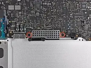 Снимите два коротких крестовых винта Phillips, крепящих маленький экранирующий щит к логической плате.