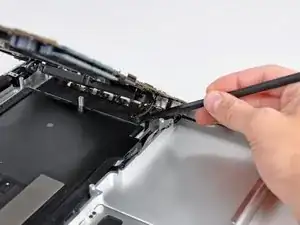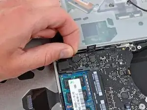 Используйте плоский конец лопатки, чтобы поднять шлейфовую ленту AirPort / Bluetooth из её гнезда на логической плате.