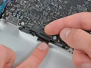 Перед повторной установкой платы удобнее всего прижать микрофон в его гнездо в левом динамике, чтобы зафиксировать его на месте.