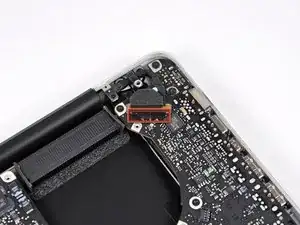 Используйте плоский конец лопатки, чтобы поддеть разъём кабеля индикатора батареи и вынуть его из гнезда на логической плате.
