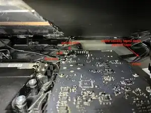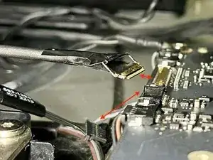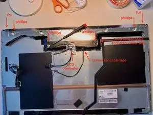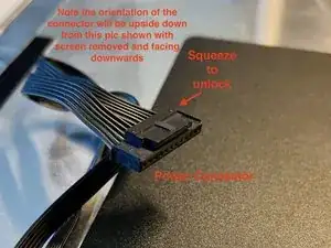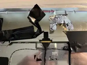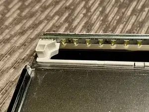 Разъём ЖК-дисплея очень труднодоступен. Это разъём с поворотной защёлкой и ручкой-лентой, аналогичной той, что на другом конце кабеля. Ручка покрыта двумя слоями клейкой ленты.