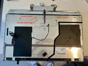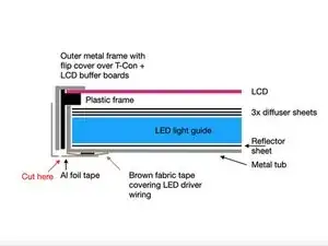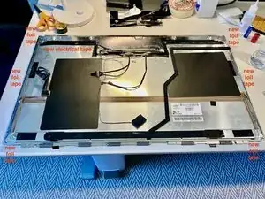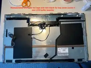 К сожалению, единственный способ убедиться, что между рассеивающей плёнкой и ЖК-панелью не попали мусор, волосок или нить, — это включить дисплей после установки. Установите белый фон и тщательно проверьте. Поэтому не заклеивайте всё окончательно — может потребоваться повторный демонтаж для подъёма ЖК-панели и удаления загрязнений.
