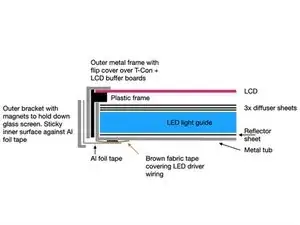 Убедитесь, что поверхность рассеивающей плёнки чистая, и по возможности сохраняйте её чистой во время разборки. Не стоит прикасаться к поверхности. Если требуется очистка, используйте мягкое чистящее средство (смесь 30% изопропилового спирта и 70% дистиллированной воды) и микрофибру для аккуратного протирания. Любые загрязнения на поверхности окажутся под ЖК-панелью.