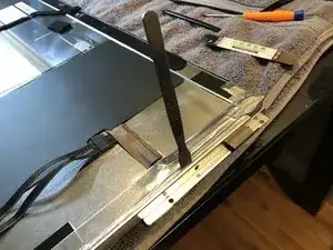 Снимите 2 боковые L-образные скобы и 1 нижнюю скобу. Каждая скоба крепится 4 винтами T10. Внутренняя сторона боковых L-образных скоб покрыта клейким слоем, что затрудняет их поддевание (используйте очень тонкую металлическую лопатку). Клейкая поверхность прилегает к тонкой фольгированной ленте, поэтому при снятии может снять часть ленты (это допустимо, так как её всё равно нужно будет снять).