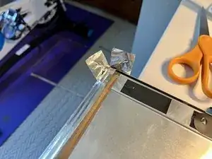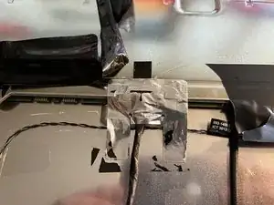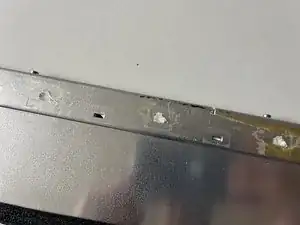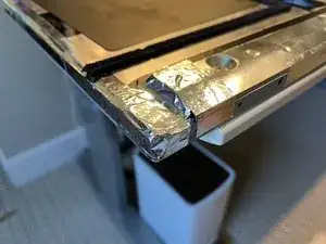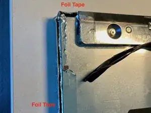 Снимите старую алюминиевую ленту и нанесите новую на шов крышки. На некоторых iMac лента перекрывает весь шов, а не разделена на три сегмента, как показано на изображении.
