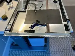 ЖК-панель теперь зафиксирована во внешней металлической раме, и сборку можно перевернуть. Убедитесь, что поверхность ровная и чистая, когда ЖК-панель находится вниз. Она не касается поверхности — по краю внешней металлической рамы установлены пенополиуретановые бамперы. Эти бамперы могут легко поцарапаться или повредиться при вращении сборки ЖК-панели на краю стола, будьте осторожны.