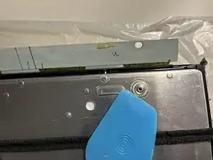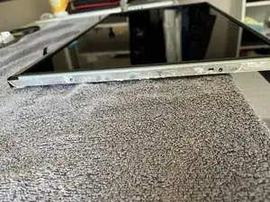 При первом выполнении процедуры лучше всего поместить сборку ЖК-панели на коробку так, чтобы буферные платы и крышка свободно свисали, и аккуратно вставить инструмент для поддева по периметру, чтобы отсоединить наружную металлическую раму. Коробка облегчит поворот ЖК-панели при работе, позволяя отсоединить три стороны (две боковые и одну со стороной с откидной планкой).