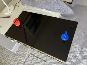 Подготовьте чистый пластиковый вкладыш на ровной поверхности. С помощью присосок снимите ЖК-панель (сначала приподнимите два угла, противоположные буферным платам) и разместите её стороной со светорассеивателем вниз на вкладыше, оставив буферные платы свисающими с края. Не используйте в качестве вкладыша материалы, оставляющие ворс. Нижнюю сторону ЖК-панели, обращённую к светорассеивающей плёнке, крайне сложно очистить от ворса без полной разборки.