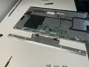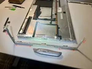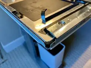 Углы на стороне с откидной планкой немного поддаются деформации. Возможно, потребуется по два инструмента с каждой стороны угла, чтобы их освободить. Действуйте осторожно, так как под наружной металлической рамой находится стекло ЖК-панели. К счастью, панель располагается в пластиковом корпусе (см. изображения на следующих шагах), поэтому защёлки не повредят её.