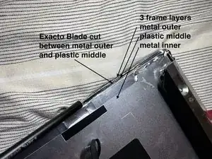 Если Вы склонны к риску, можно использовать канцелярский нож, чтобы разрезать между наружной металлической рамой и пластиковой рамой. При приближении к области коричневой ленты будьте осторожны, чтобы не повредить её и находящиеся под ней светодиодные провода.