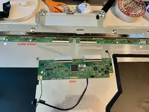 Отсоедините разъём гибкого кабеля платы Т-кон от буферной платы с стороны буферной платы. Аккуратно пошевелите платой Т-кон, чтобы освободить гибкий кабель из разъёма (при первом отсоединении может быть сложно).