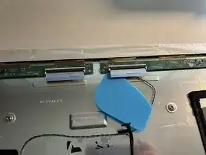 Вставьте гибкий кабель T-Con в разъём платы-буфера. Заблокируйте фиксатор разъёма. Установите плату T-Con на место и прижмите к липкой ленте.