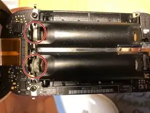 Возможно, вам также придётся соскрести хрупкие белые отложения с других концов этих штифтов, которые находятся снаружи отсека батареек. Аккуратно раздвиньте «челюсти» мыши, не перегружая ленточный шлейф. Соскребите штифты до полной чистоты.