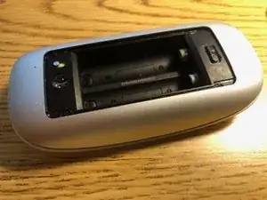 Наша цель — снять алюминиевую оболочку, покрывающую дно мыши. Начните с удаления крышки отсека батареек. Две чёрные пластиковые направляющие должны легко отщёлкнуться. Извлеките батарейки.