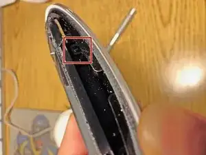 Действуя осторожно, возьмите маленький рычажок и подденьте одну из пластиковых петель, чтобы снять её с чёрного пластикового штифта. Подденьте петлю наружу, одновременно слегка раздвигая верхнюю и нижнюю половины мыши. Петля должна отщёлкнуться с чёрного пластикового штифта.