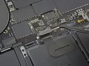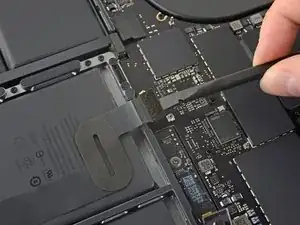 С помощью лопатки отсоедините кабель трекпада, аккуратно поддев его разъем и поднимая прямо вверх от логической платы.