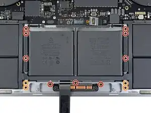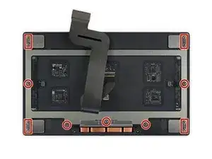 Используйте отвертку Torx T5, чтобы выкрутить 13 винтов, фиксирующих узел трекпада: