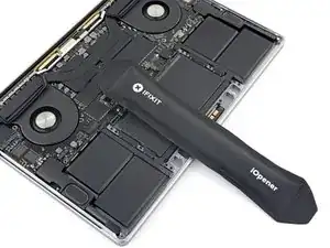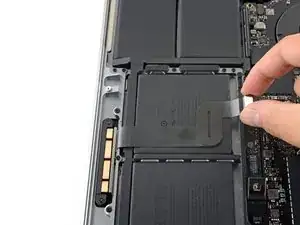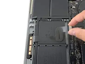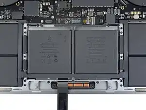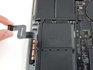 Нанесите слабое тепло на ленточный кабель трекпада, чтобы размягчить клей, фиксирующий его на аккумуляторе.