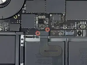 Используйте отвертку Torx T3, чтобы выкрутить два винта 1,8 мм, фиксирующих крышку кронштейна разъемов кабелей клавиатуры и трекпада.