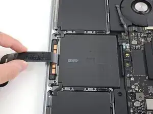 Аккуратно отлейте ленточный кабель трекпада от аккумулятора и отодвиньте его в сторону.