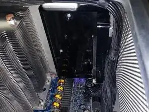 Вам нужно снять серую сборку вентилятора с левой стороны (она уже отсутствует на фото); для этого необходимо открутить 4 винта в отсеке для памяти справа, сдвинуть его вправо и снять среднюю крышку для процессоров