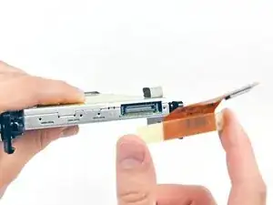 Аккуратно извлеките оптический привод из заднего корпуса, заботясь о двух пластиковых штифтах, вмонтированных в задний корпус рядом с открытым концом оптического привода, которые могут отломиться.