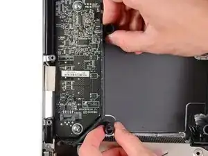 Слегка оттяните плату логики от задней части внешнего корпуса, затем поднимите её вверх, чтобы освободить нижнюю переднюю грань внешнего корпуса.