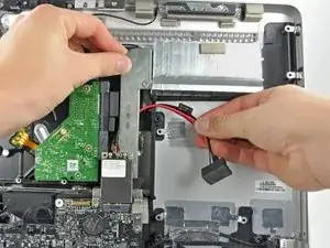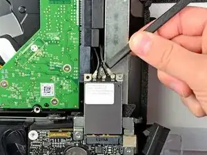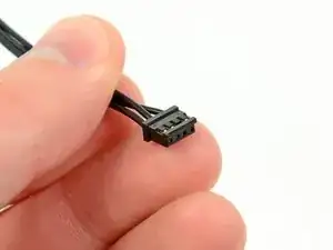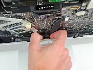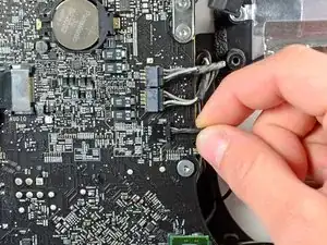Потяните разъём вентилятора жёсткого диска к верхнему краю iMac, чтобы отсоединить его от гнезда на логической плате.