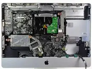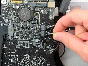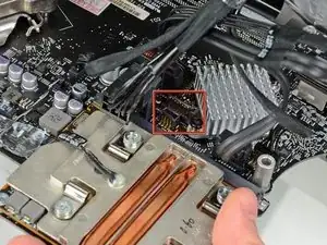Потяните разъём вентилятора ЦП/датчика окружающей температуры к нижнему левому краю iMac и выньте его из гнезда на логической плате.