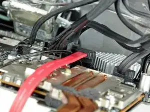 При посадке платы логики в гнездо проведите кабели жёсткого диска через небольшой канал, вырезанный в пластиковой прижимной стенке рядом с рёбрами радиатора графического процессора.