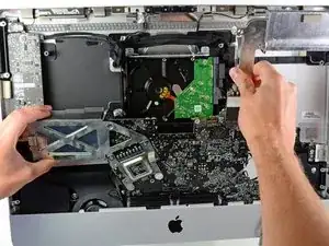 Снимите защитную подложку с двусторонней ленты и поместите жёсткий диск внутрь iMac.