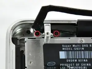 Удалите два чёрных винта Phillips #0, фиксирующие маленький металлический монтажный кронштейн. Перенесите этот кронштейн на новый оптический привод или корпус для жёсткого диска.